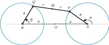 Mécanisme ou "cheval" de Tchébychef. AB = 4, AP = BQ = 5, PQ = 2, M milieu de [PQ] |