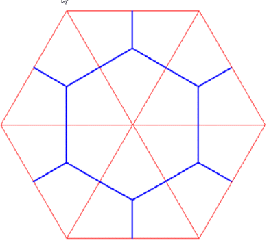 Pavage hexagonal (en bleu : dual du pavage triangulaire en rouge) |
