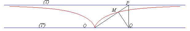 The simplest construction of cissoid of Diocles is by double projection on two parallel lines: given two parallel lines (T) and (T') and a point O on (T'), a variable point P on (T) is projected on the point Q on (T'), which in turn is projected on M on (OP): the cissoid of Diocles is the locus of M.