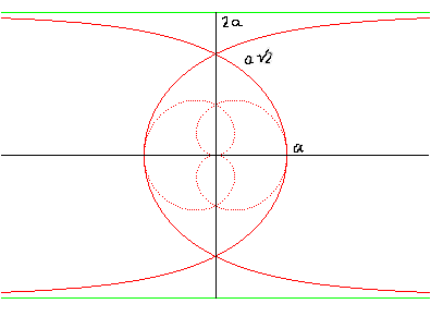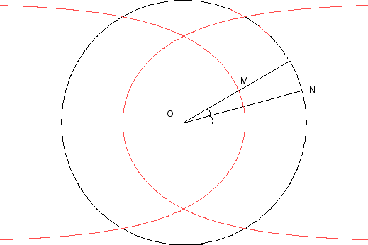 | Given a circle (C) (here, the circle with centre O and radius 2a) and a line (D0) passing through the centre of the circle (here Ox), the Delanges trisectrix is the locus of the point M on a variable line (D) passing through O such that the line parallel to D passing through M cuts (C) at N in such a way that (ON) is a bisector of (D0) and (D). |