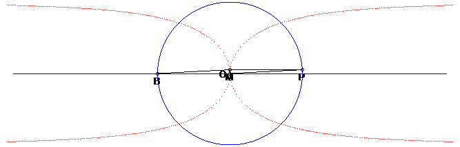 | Other construction, equivalent to the previous one: the Kappa is the locus of the vertex M of a right triangle at OPOM, when P describes the circle with centre O and (PM) remains parallel to a fixed line. This construction is a limit case of the construction of a curve as the locus of the orthocentre of a triangle with fixed base (here, reduced to the point O) while the vertex (here P) describes a given curve, see for example the construction of the bicorn. |