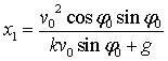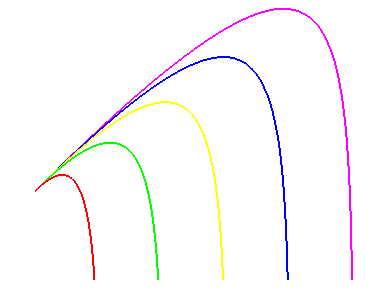 | Opposite, figure composed of the trajectories starting from a fixed point with constant initial speed, shooting angle of 45°, and an increasing friction coefficient. | ![]() |