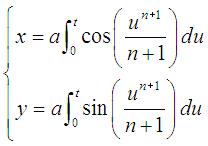 | Intrinsic equation 1: Intrinsic equation 2: Cartesian parametrization: Curvilinear abscissa: s = at. Radius of curvature: |