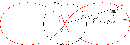| Given a circle (C) with centre O and radius a and a line (D) passing by O ((D) is here Ox), the Ceva trisectrix is the locus of the point M such that OP = PQ = QM with P on (C), Q on (D) and such that O, P and M are aligned.