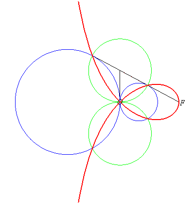 = PO| La strophoïde droite est donc aussi le lieu des points de contact des tangentes issues de F aux cercles (en bleu ci-contre) tangents en O à l'axe (D0), ou encore le lieu des intersections des cercles orthogonaux aux précédents (en vert ci-contre) tangents en O à (OF) avec les droites joignant F à leurs centres. | ![]() |