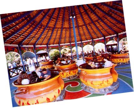 | C'est une trajectoire de ce type que parcourent ces adeptes des chaudrons magiques du parc Astérix ; les chaudrons décrivent des épitrochoïdes ; si le chaudron tourne sur lui même, la courbe décrite par les occupants est une tritrochoïde. | ![]() |