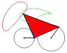 Une courbe du trois-barres est donc le lieu d'un point lié à un segment de longueur constante joignant deux cercles - les cercles (CA) et (CB) de centres A et B et de rayon b et c.