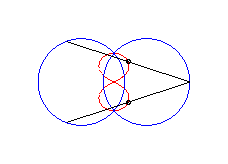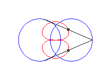 cas a = c = b/2 : trois cercles; pour les deux petits cercles rouge, le quadrilatère articulé est entièrement replié sur lui-même |