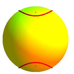 Spherical coordinates of the foci F, F': Bifocal equation of the spherical ellipse on the sphere with radius R: Bifocal equation of the spherical hyperbola: Cartesian equation of the whole curve: section of the sphere