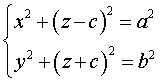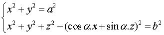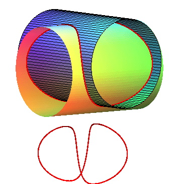 : Biquadratique. Paramétrisation cartésienne : Equation cartésienne de la projection sur xOy : Pour - Aire de la portion de cylindre délimitée par chaque composante, donnée par une intégrale elliptique de deuxième espèce : - Volume de la portion du grand cylindre