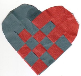 On pourra remarquer que le tissage représenté à gauche est en fait un entrelacs trivial. C'est d'ailleurs la raison pour laquelle il est réalisable en papier crépon sans déchirure ! | ![]() |
