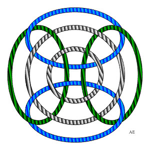 ![]() ![]() Le plus simple des entrelacs : celui de Hopf 2.2.1 qui est aussi l'entrelacs torique de type (2,2) ; la somme de n entrelacs de Hopf donnant un entrelacs à n + 1 anneaux comme ceux des Jeux. |