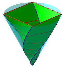 | Relèvements sur paraboloïde hyperbolique de spirales d'Archimède à gauche, logarithmiques à droite. | ![]() |