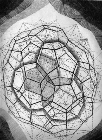 | Ci-contre deux projections planes de l'une des projections orthogonale 3D des arêtes et des sommets de l'hyperdodécaèdre ; l'enveloppe convexe des sommets de cette projection 3D est un triacontaèdre rhombique tronqué. | ![]() |
