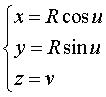 Equation of the cylinder with radius R and axis (O, Cylindrical equation: Cartesian equation: Cartesian parametrizations: Developable quadric. First fundamental quadratic form: Surface element: Second fundamental quadratic form: |