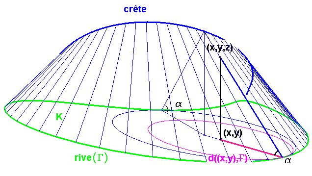 It is the envelope of the family of trunks of cones of revolution with angle at the vertex equal to the complement of a and the base disk of which is included in K and bitangent to its boundary (the bank (G)). The locus of the vertices of these cones is called the ridge; it is the curve the projection of which is included in the set of points at same distance of at least two points on (G), sometimes called the skeleton of this curve (see equidistance curve).