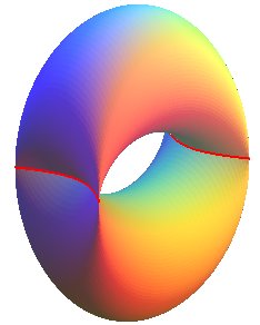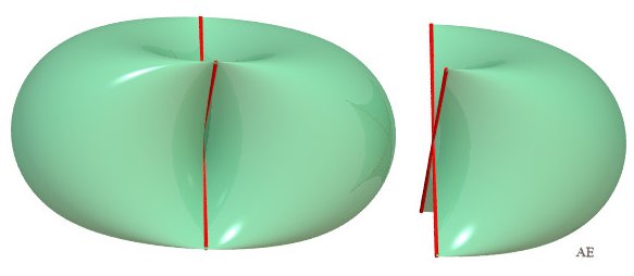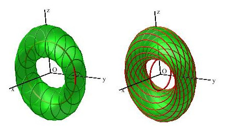 Comme pour toute surface de translation, cette définition est symétrique : (S) est aussi la surface engendrée par le cercle de rayon a dont le centre décrit le cercle fixe de centre O de Q de rayon b et dont le plan reste parallèle à P. |