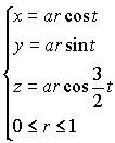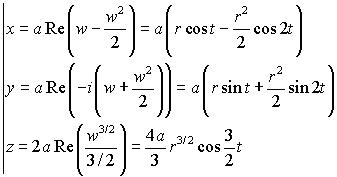 | Les projections sur xOy des lignes r = cte sont des hypotrochoïdes à 3 branches. | Comparer avec un demi-cône sinusoïdal : |