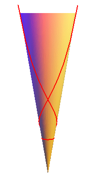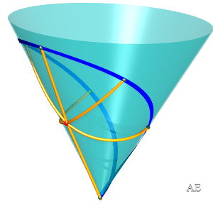 Voir aussi les cycloïdes sphériques, lieux d'un point d'un cone de révolution roulant sans glisser sur un autre cone de révolution, ainsi que les ovales de Descartes, projections de l'intersection de deux cônes de révolution d'axes parallèles.