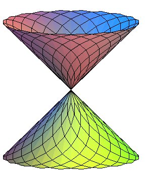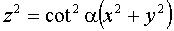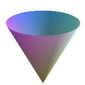 En notant Équation cylindrique : Équation cartésienne : . Paramétrisation cartésienne : Paramétrisation à partir des coordonnées polaires Première forme quadratique fondamentale : Elément d'aire : Deuxième forme quadratique fondamentale : Rayons de courbures principaux : Le cône droit de directrices Ox et Oy et d'axe la droite y = x, z = 0 a pour équation cartésienne : Le cône de directrices Ox Oy et Oz et d'axe la droite x = y = z a pour équation cartésienne : xy + yz + zx = 0 (l'angle au sommet vaut arccos (-1/3) » 109 ° 28 ') Volume d'un tronc de cône limité par un sommet, de base de rayon R et de hauteur h : Aire correspondante : |