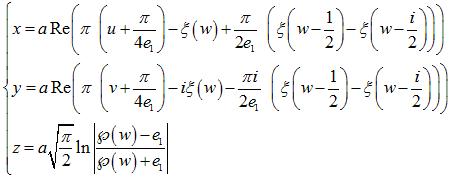 La surface de Costa est invariante par retournement autour de l'axe x = y, z = 0 (dans la paramétrisation ci-dessus, y(u,v)=x(v,u) et z(v,u)=-z(u,v)), et dans ce retournement, les deux faces de la surface sont échangées. Ci-contre, deux demi-surfaces. Vérifier que l'une est le retournement de l'autre. |