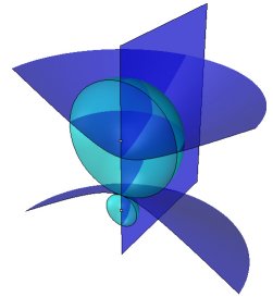 | ...un ellipsoïde et un hyperboloïde H2 lorsque les sphères sont sécantes : | ![]() |