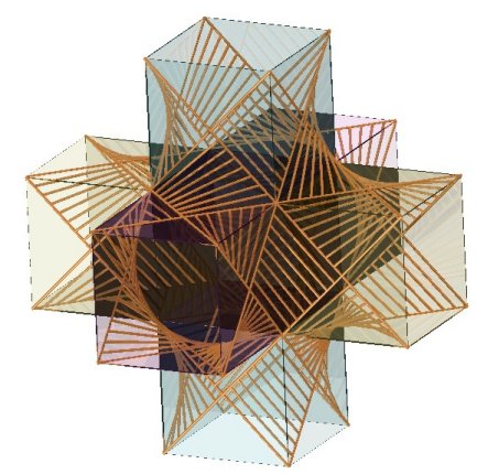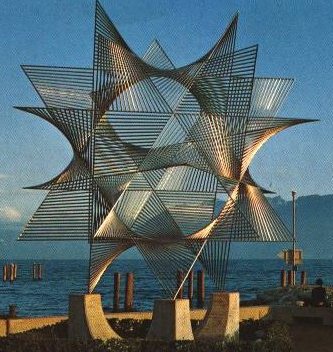 Structure formée à partir de 2 polygones réguliers à n côtés et 2n génératrices d'un hyperboloïde de révolution (joignant 2 milieux de côté de ces polygones) . Les 3n losanges gauches obtenus sont remplis par des génératrices de paraboloïde hyperbolique. (réalisation : Alain Esculier) |