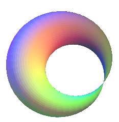 | On obtient une immersion 3D de la bouteille de Klein pour k = 1/2 et a > b > 0 ; les sommets principaux de l'ellipse génératrice décrivent deux cercles et les sommets secondaires une courbe de Viviani (en bleu ci-contre). | ![]() |