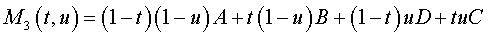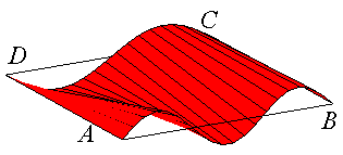 Patch bilinéaire paramétré par M3 portion de paraboloïde hyperbolique s'appuyant sur le quadrilatère gauche ABCD. Le patch est plan si les 4 sommets sont coplanaires. |