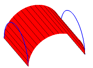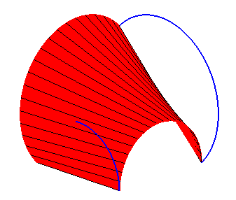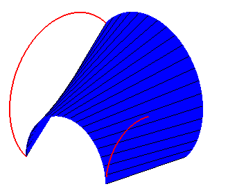 Première surface réglée paramétrée par M1 joignant les points P1(t) aux points Q1(t). |