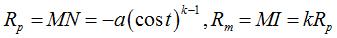 pour k = 1 on obtient le cercle, pour k = 2 la cycloïde, pour k = 1/2 la lintéaire droite, pour k = –1 la chaînette, et pour k = – 2 la parabole (de directrice Oz). |
