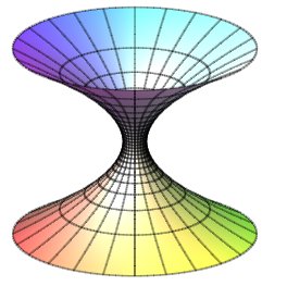 Vue des demi-surfaces pour k = – 2 (paraboloïde de Flamm) et k = –1 (caténoïde). |
