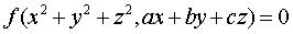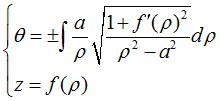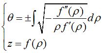 Équation cartésienne générale des surfaces de révolution d’axe dirigé par (a, b, c) : Équation cartésienne générale des surfaces de révolution d’axe Oz : Équation cylindrique : Équation sphérique : Équation aux dérivées partielles : Paramétrisation cartésienne : En particulier pour une génératrice plane Dans ce dernier cas : Première forme quadratique fondamentale : Elément d’aire : Deuxième forme quadratique fondamentale : Courbure méridienne : Courbure de Gauss : Les lignes de courbure sont les méridiennes et les parallèles ( Les lignes asymptotiques ont pour équation cylindrique : Les géodésiques ont pour équation cylindrique : Théorèmes de Guldin : L'aire de la surface de révolution engendrée par la rotation d'un arc de courbe plane autour d'un axe de son plan ne traversant pas l'arc de courbe est égale à Le volume du solide de révolution engendré
