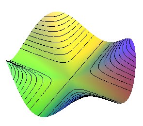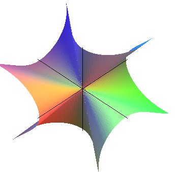 aboutissent n vallées et n montagnes : Le cas n = 2 donne la selle de cheval ou paraboloïde hyperbolique et le cas n = 3 la selle pour singe. Proposition d'appellation par Paul Micaelli : selle pour pieuvre... |