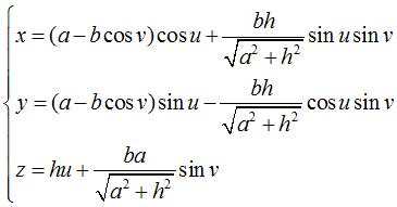 Paramétrisation cartésienne : h > 0 : serpentin dextre, h = 0 : tore, h < 0 : serpentin senestre. Surface de Monge. Lignes de courbure : les cercles et les parallèles à l'hélice. |